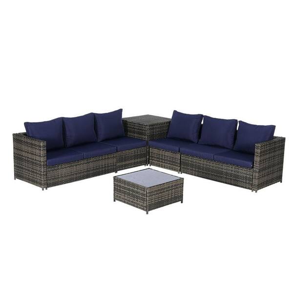 6-Pieces Metal Outdoor Woven Sectional L-Shaped Patio Conversation Set with Dark Blue Cushion