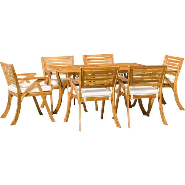 7-Piece Acacia Wood Outdoor Dining Set with White Cushions, Patio Furniture Set for Garden, Backyard and Poolside, Teak