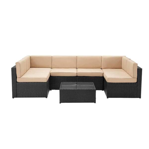 7-Piece Black Wicker Patio Conversation Set with Blue Cushions and Coffee Table