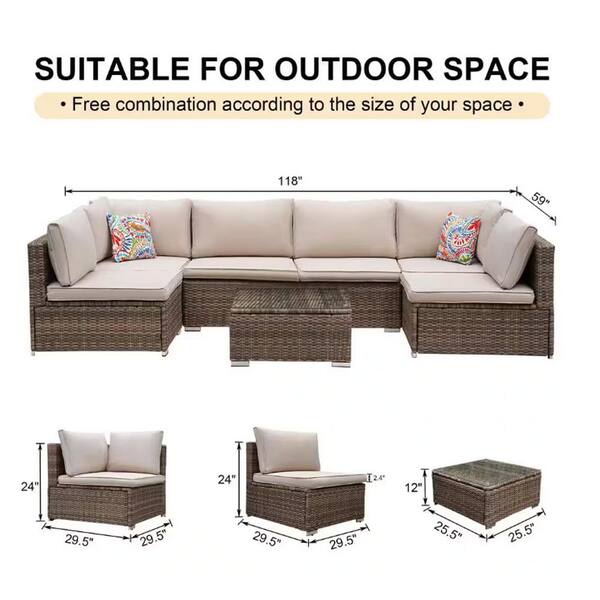 7-Piece Brown Wicker Outdoor Sectional Sofa Set Patio Conversation Set with Beige Cushions