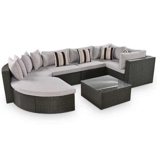 7-Piece Brown Wicker Outdoor Sofa Sectional Set with Gray Cushions and Colorful Pillows