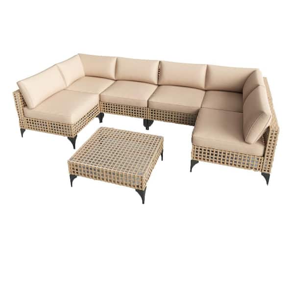7-Piece Brown Wicker Patio Conversation Set with Khaki Cushions and Coffee Table