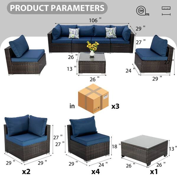 7-Piece PE Rattan Wicker Outdoor Patio Conversation Set with Peacock Blue Cushions