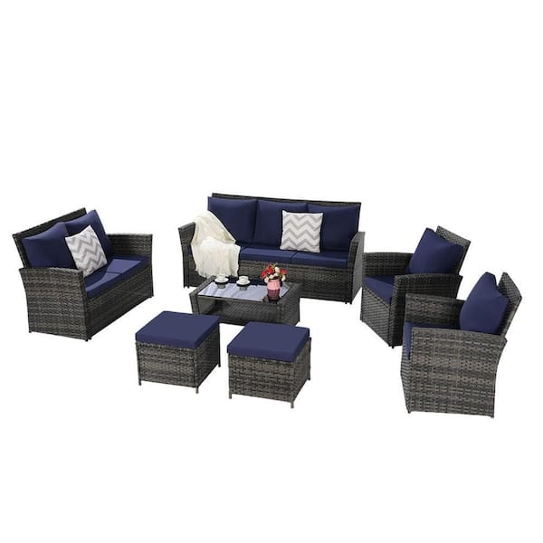 7-Piece Wicker Outdoor Conversation Patio Furniture Set with Dark Blue Cushions