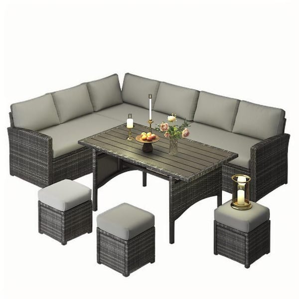 7-Piece Wicker Outdoor Dining Set with Gray Cushions, Patio Rattan Furniture Set for Garden, Backyard and Poolside