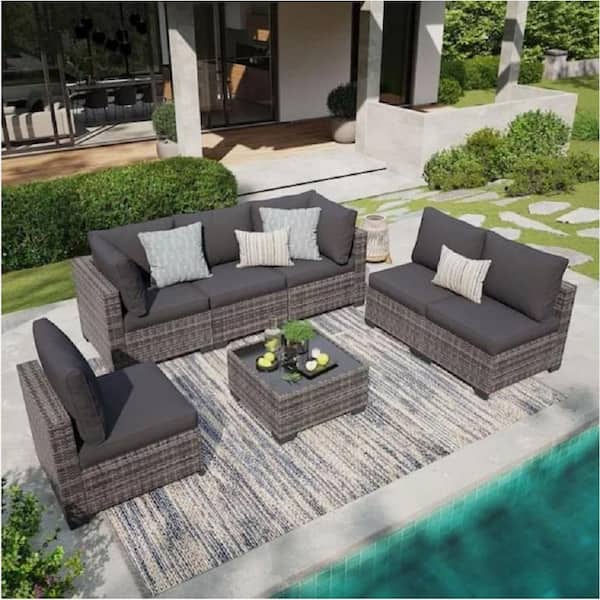 7-Piece Wicker Outdoor Patio Conversation Set with Gray Cushions and Glass Coffee Table