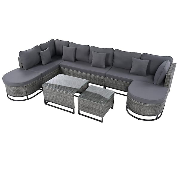 7-Piece Wicker Rattan Outdoor Sectional Set with Gray Cushions, Patio Sofa Set with 2-Coffee Table for Garden and Deck