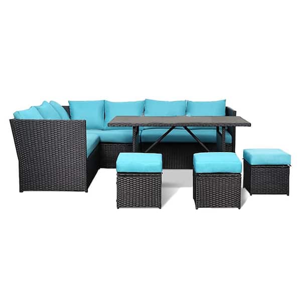 7-Pieces Black Wicker All Weather Outdoor Sofa Sectional Set with Blue Cushions and Coffee Table