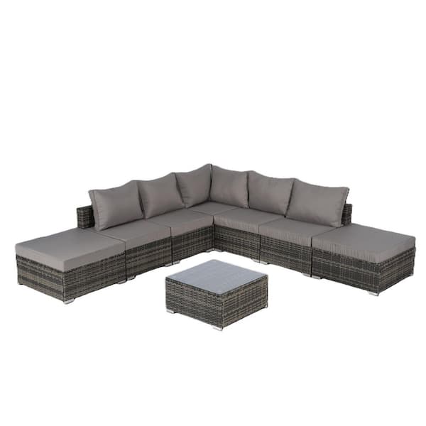 8-Piece Wicker Outdoor Sectional Set with Dark Gray Cushions and Glass Coffee Table, Furniture Conversation Sets
