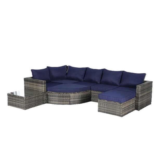 8 Pieces Wicker Patio Conversation Set with Dark Blue Cushions, Patio Sectional Sofa Set for Backyard, Poolside, Garden