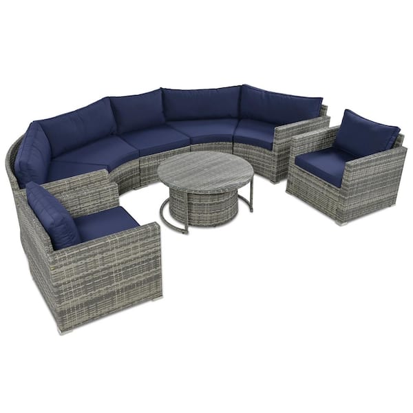 9-Piece Patio PE Wicker Outdoor Sectional Set-Gray Modern Style Sofa with Blue Cushions