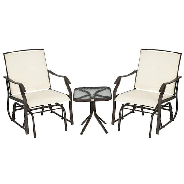 Beige 3-Piece White Metal Gliding Chair and Tea Table Set Lawn Chair with Glass Tabletop