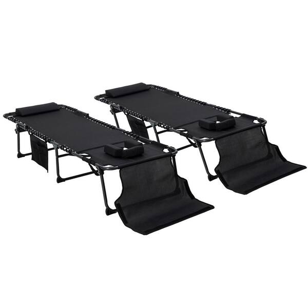 Black 2-Piece Metal Outdoor Folding Chaise Lounge with 5-level Reclining Back, Face Hole, Side Pocket and Headrest