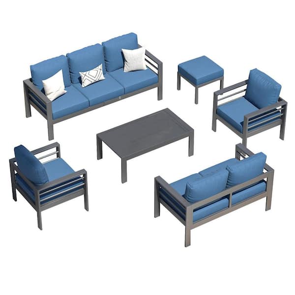 Black 7-Piece Aluminum Patio Conversation Set with Blue Cushions, Coffee Table and Stool for Garden, Backyard