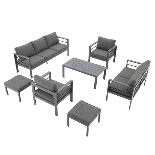 Black 7-Piece Aluminum Patio Conversation Set with Dark Grey Cushions, Coffee Table and Stool for Garden, Backyard