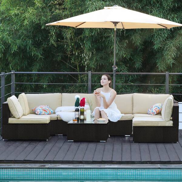 Black 8-Piece Wicker Patio Conversation Set, Sofa Set with Beige Cushions, Glass Table and Fire Pit