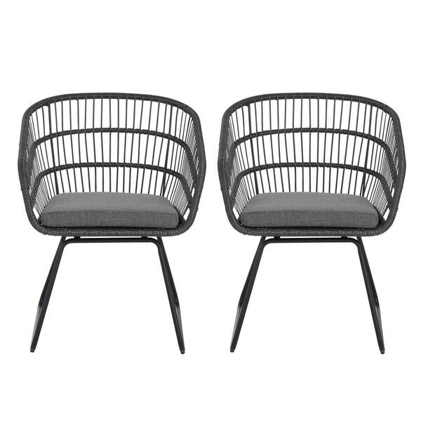 Black PE Rattan Outdoor Patio Dining Chairs with Gray Cushions (2-Pack)
