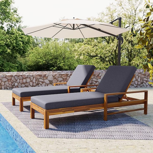 Brown 1-Piece Acacia Wood Outdoor Patio Chaise Lounge with Gray Cushions