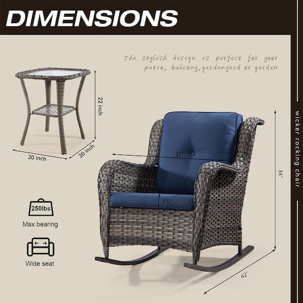Brown 3-Piece Patio Wicker Outdoor Rocking Chair Set with Blue Cushions