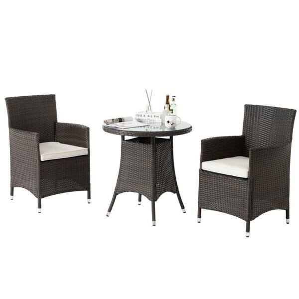 Brown 3-Piece Wicker Outdoor Bistro Set, Patio Furniture Sets with Beige Cushion