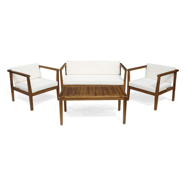Brown 4-Piece Wood Patio Conversation Set with Beige Cushions