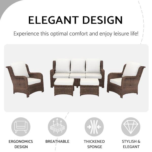 Brown 5-Piece Metal Patio Conversation Set with Off White Cushions, 3-Seat Outdoor Couch, 2 Single Chair and 2 Ottoman