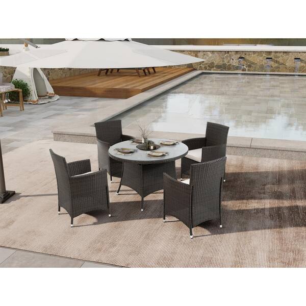 Brown 5-Piece Wicker Outdoor Dining Set with Beige Cushion, Patio Dining Table and Chairs