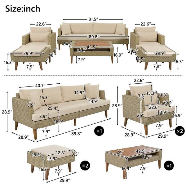 Brown 6-Pieces Wicker Outdoor Sectional Set with Light Brown Cushions, Table Cover and 4 Pillows