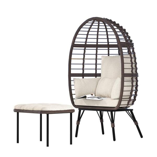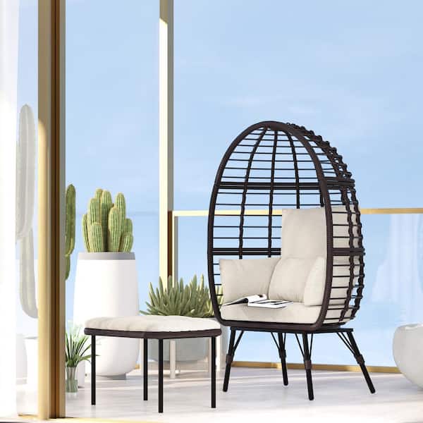 Brown Wicker Patio Swing Egg Chair with Beige Cushion, Indoor Outdoor Lounger for Patios, Living Room