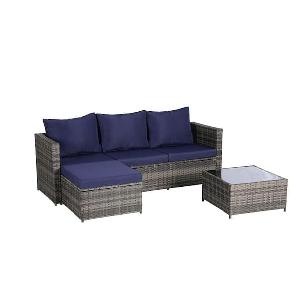 Gray 2-Piece Wicker L- Shaped Patio Conversation Set with Dark Blue Cushions, Ottoman and Detachable Table