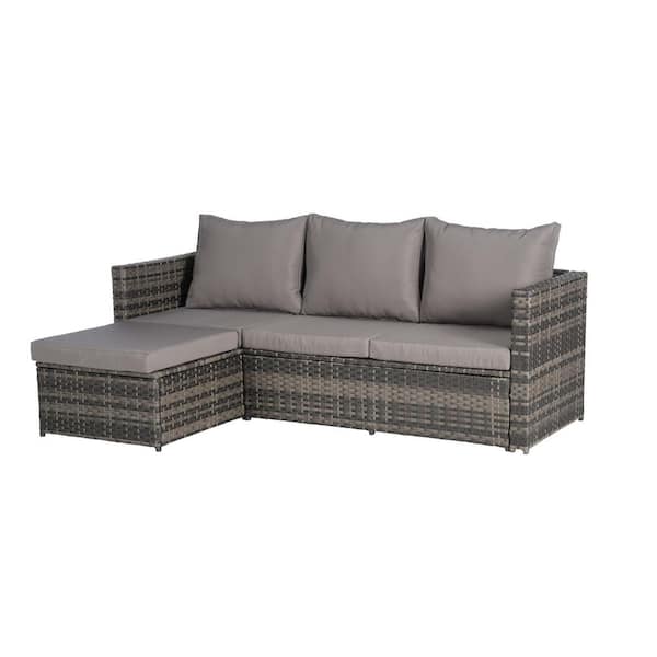 Gray 2-Piece Wicker L- Shaped Patio Conversation Set with Dark Gray Cushions, Ottoman and Detachable Table