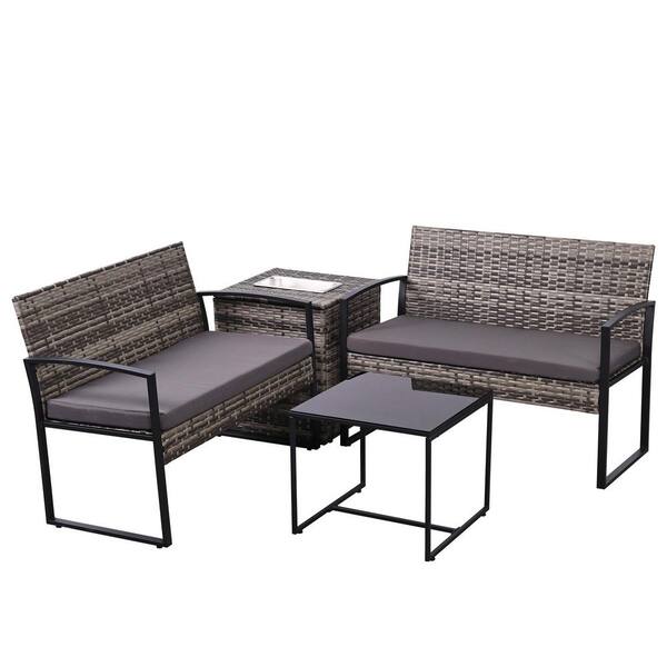 Gray 4-Piece Wicker Patio Conversation Set with Table and Gray Cushions and Ice Bucket Storage for Backyard Garden