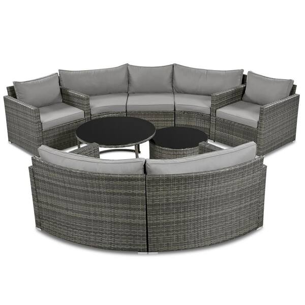Gray 9-Piece Wicker Outdoor Half-moon Patio Sectional Set Round Sofa Set with Gray Cushions and 2-Overlapping Tables