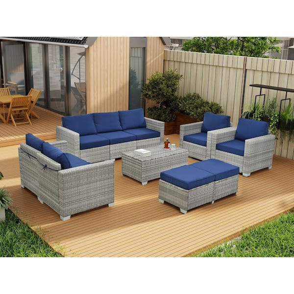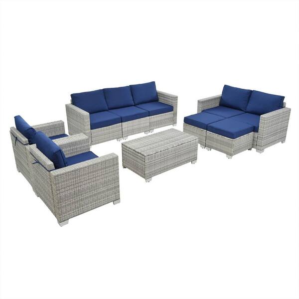 Grey White 10-Piece Wicker Outdoor Sectional Set with Dark Blue Cushions and Tempered Glass Coffee Table