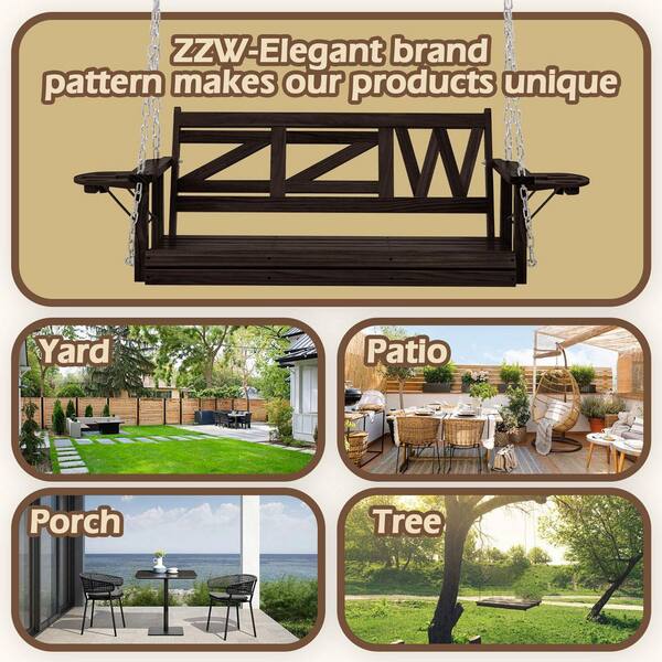 Heavy Duty Wood Porch Swing, 550 LBS Outdoor Patio Swing Bench with Hanging Chains and Upgraded Cupholders, Dark Brown