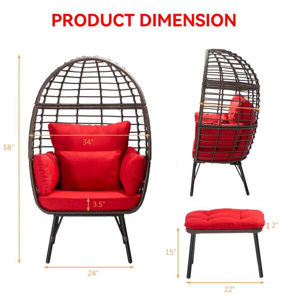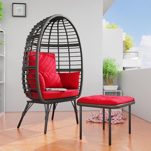 Patio Brown Wicker Indoor/Outdoor Egg Lounge Chair with Ottoman and Red Cushions