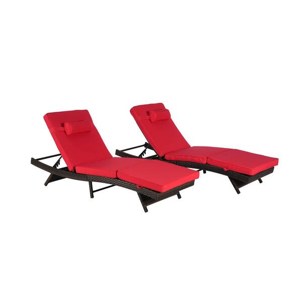 Set of 2 Brown Wicker Outdoor Lounge Chair, Recliner up to 150° with Red Cushion