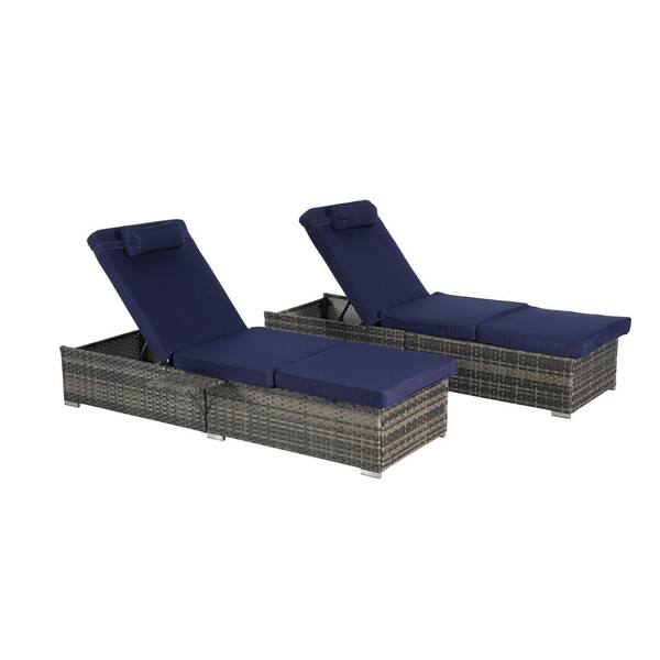 Set of 2 Gray Wicker Outdoor Lounge Chair with Dark Blue Cushions, Adjustable Backrest, Side Tables