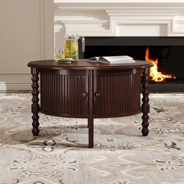 Walnut Round Wood Outdoor Coffee Table with Sliding Door