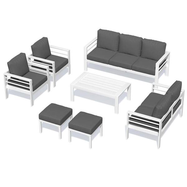 White 7-Piece Aluminum Patio Conversation Set with Dark Gray Cushions, Coffee Table and Stool for Garden, Backyard