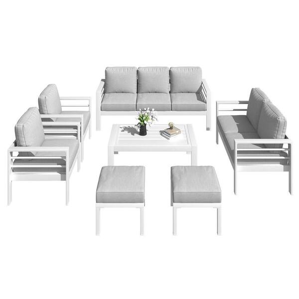 White 7-Piece Aluminum Patio Conversation Set with Light Gray Cushions, Coffee Table and Stool for Garden, Backyard