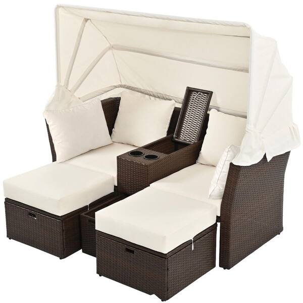 Wicker Outdoor Day Bed, Loveseat Sofa with Beige Cushions and Foldable Awning
