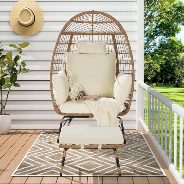 Wicker Outdoor Lounge Chair, Egg Chair with Beige Cushions and Ottoman
