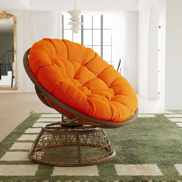 Wicker Outdoor Lounge Chair with Orange Cushions and 360° Swivel Base, Sturdy Frame