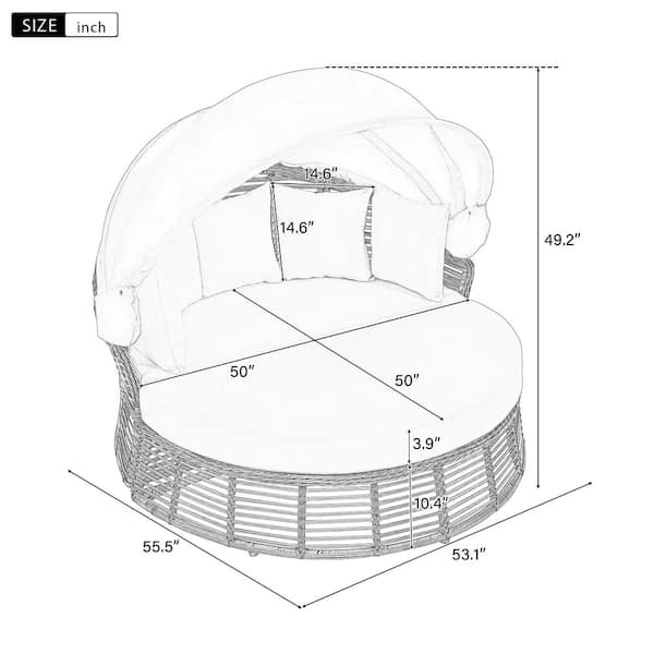 Wicker Patio Outdoor Double Day Bed Round Sofa Furniture Set with Beige Cushions and Retractable Canopy