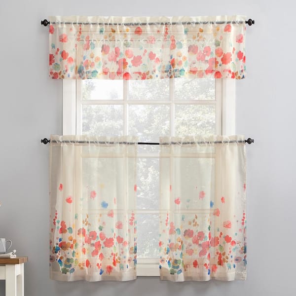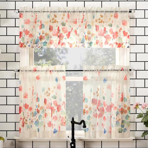 Rosalee Poppy Red Polyester 54 in. W x 36 in. L Rod Pocket Light Filtering Curtain Set for Kitchens (Set of 3)