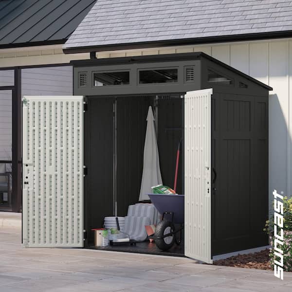 Modernist 6 ft. x 5 ft. Plastic Resin Storage Shed with Floor (36 sq. ft.) in Peppercorn (Gray) with White Doors