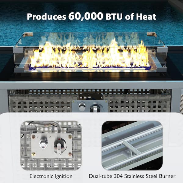 43 in. Propane Gas Fire Pit Table, 60000 BTU Rectangular Open Weave Wicker Fire Pit with Glass Wind Guard in Gray