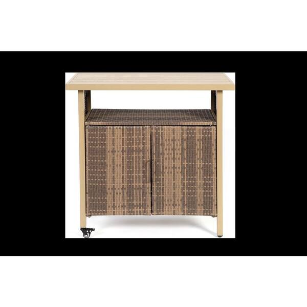 Outdoor Wicker Bar Cart, Patio Wine Serving Cart with Wheels, Rolling Rattan Beverage Bar Counter Table with Glass Top