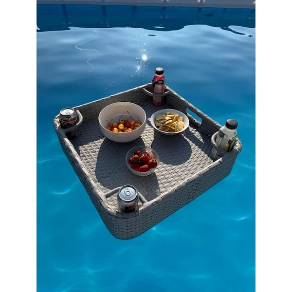 Grey 24 in. x 24 in. Floating Tray for Pool Wicker Serving Table Aluminum Frame Breakfast Tray for Swimming Pool